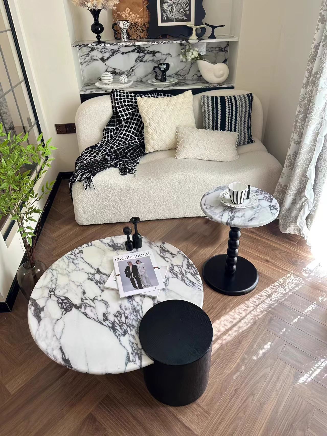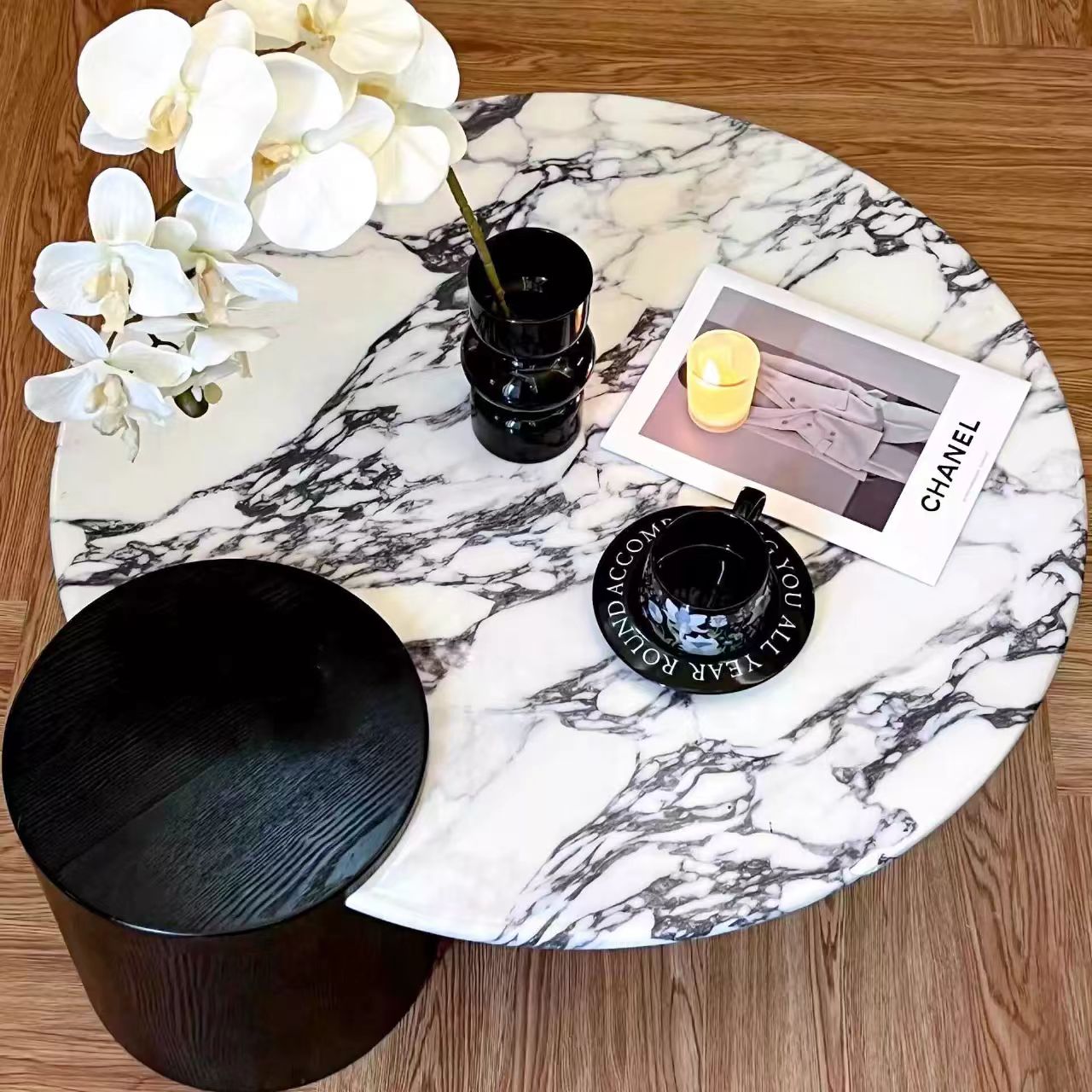 Круглый журнальный столик из минеральной плиты для малогабаритных гостиных